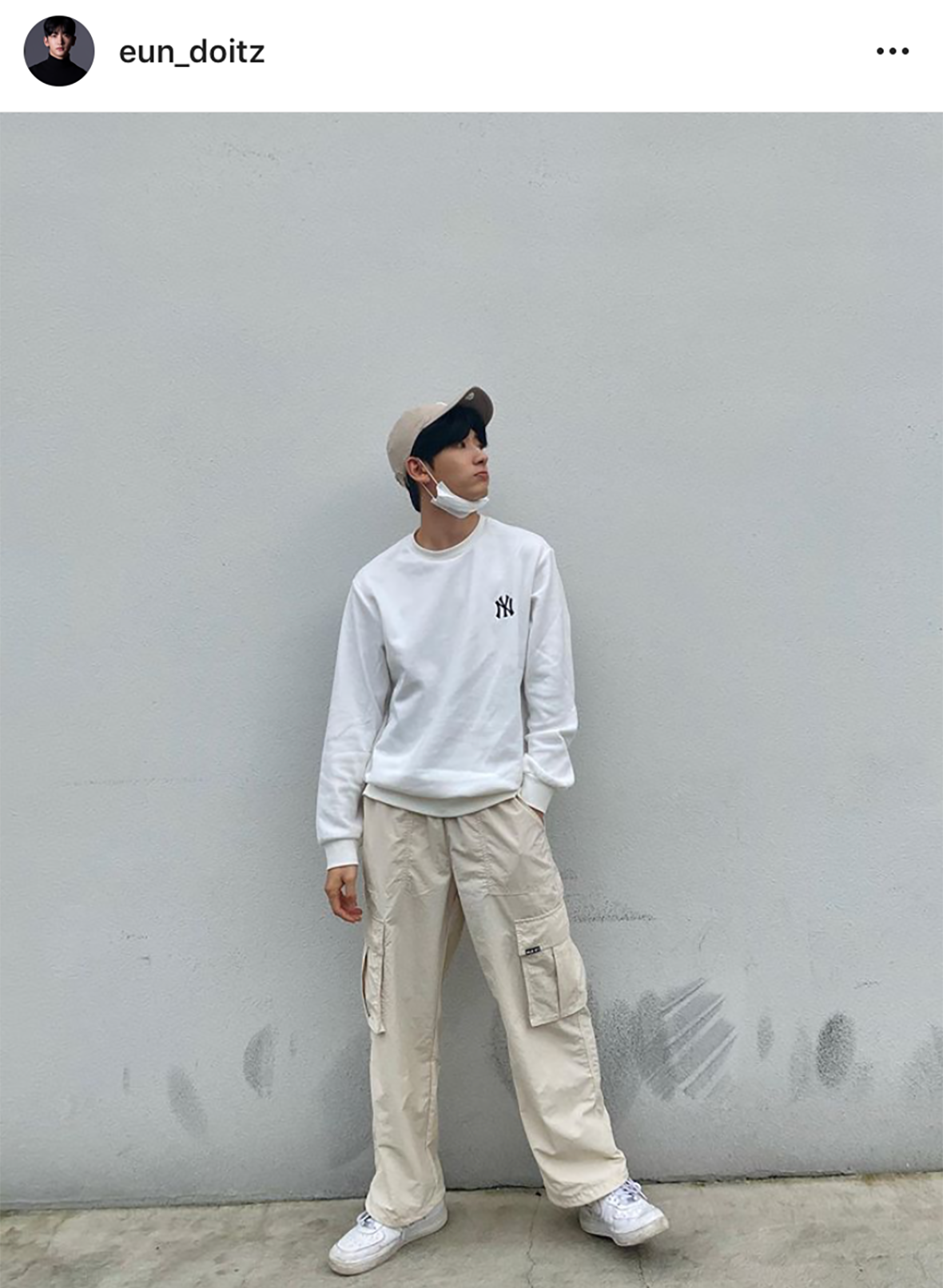 白色NY卫衣,运动鞋,米色棉布裤,棒球帽的搭配组合吸引了目光!:)