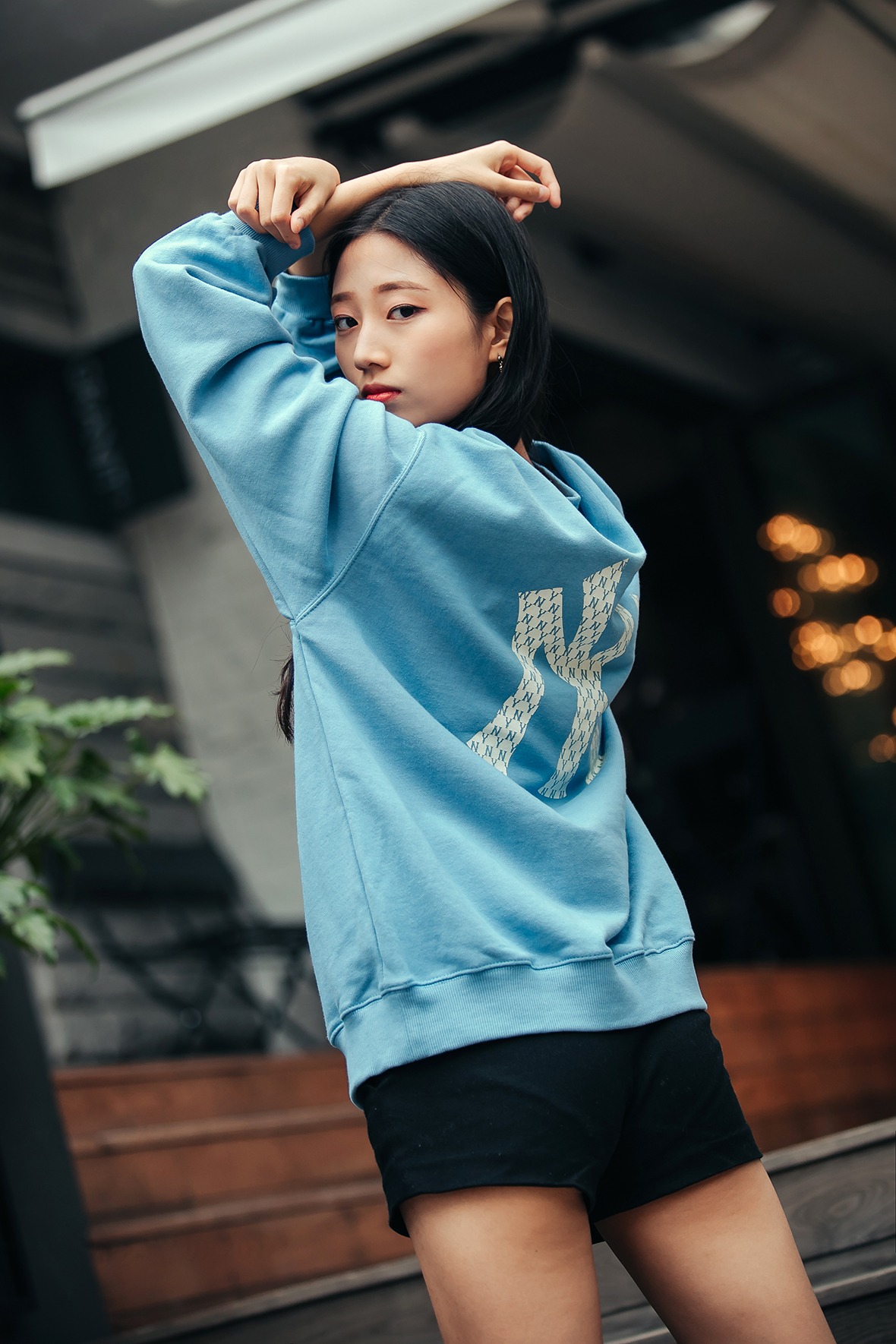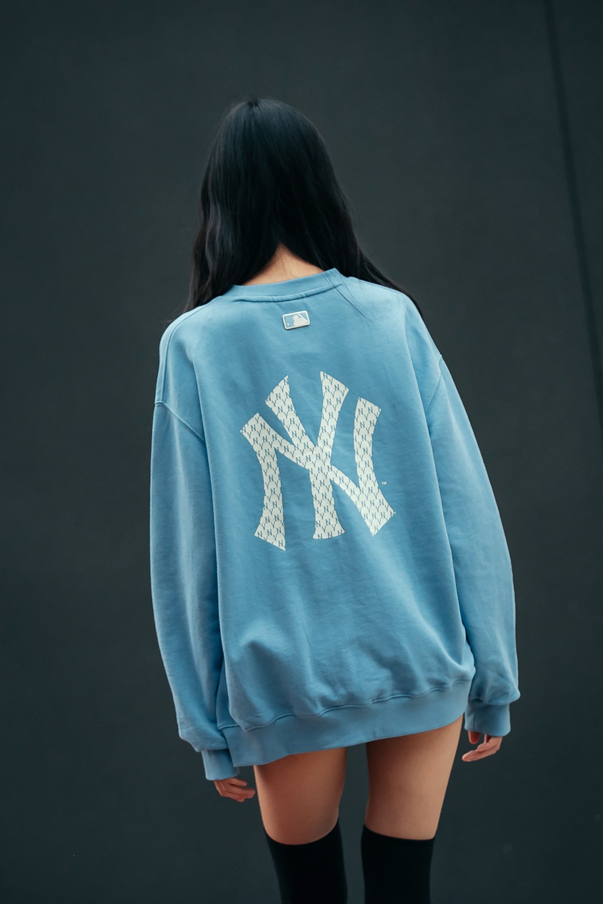 盖过屁股长度的MLB Monogram卫衣搭配黑色短裤营造出个性美,