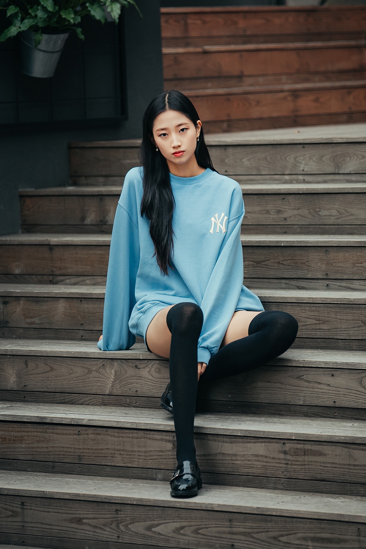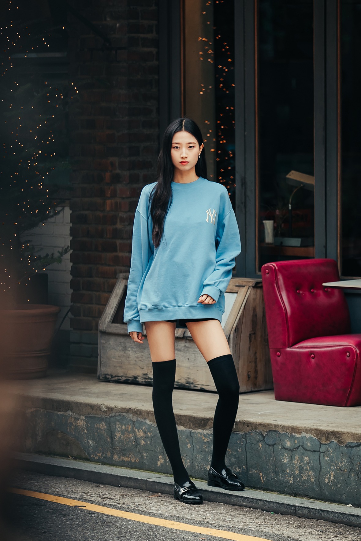 还有长筒袜与漆皮小皮鞋的搭配,体现了季节感的下衣失踪时尚完成。