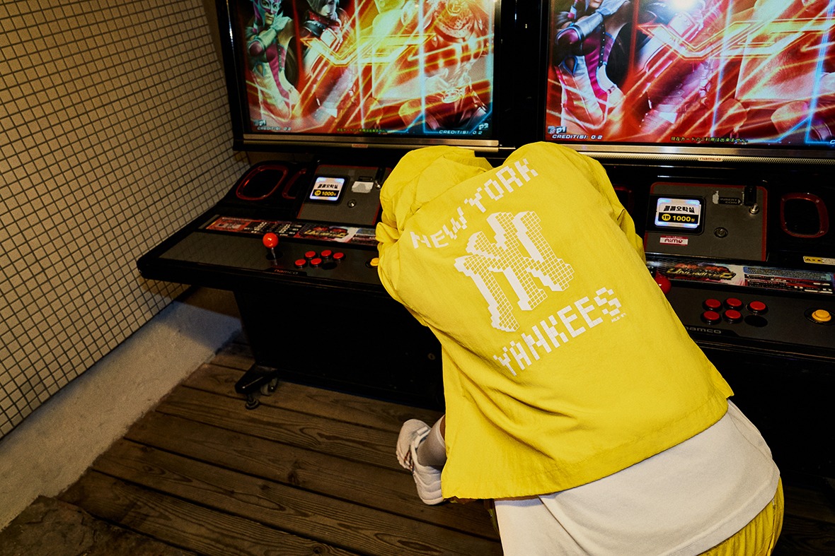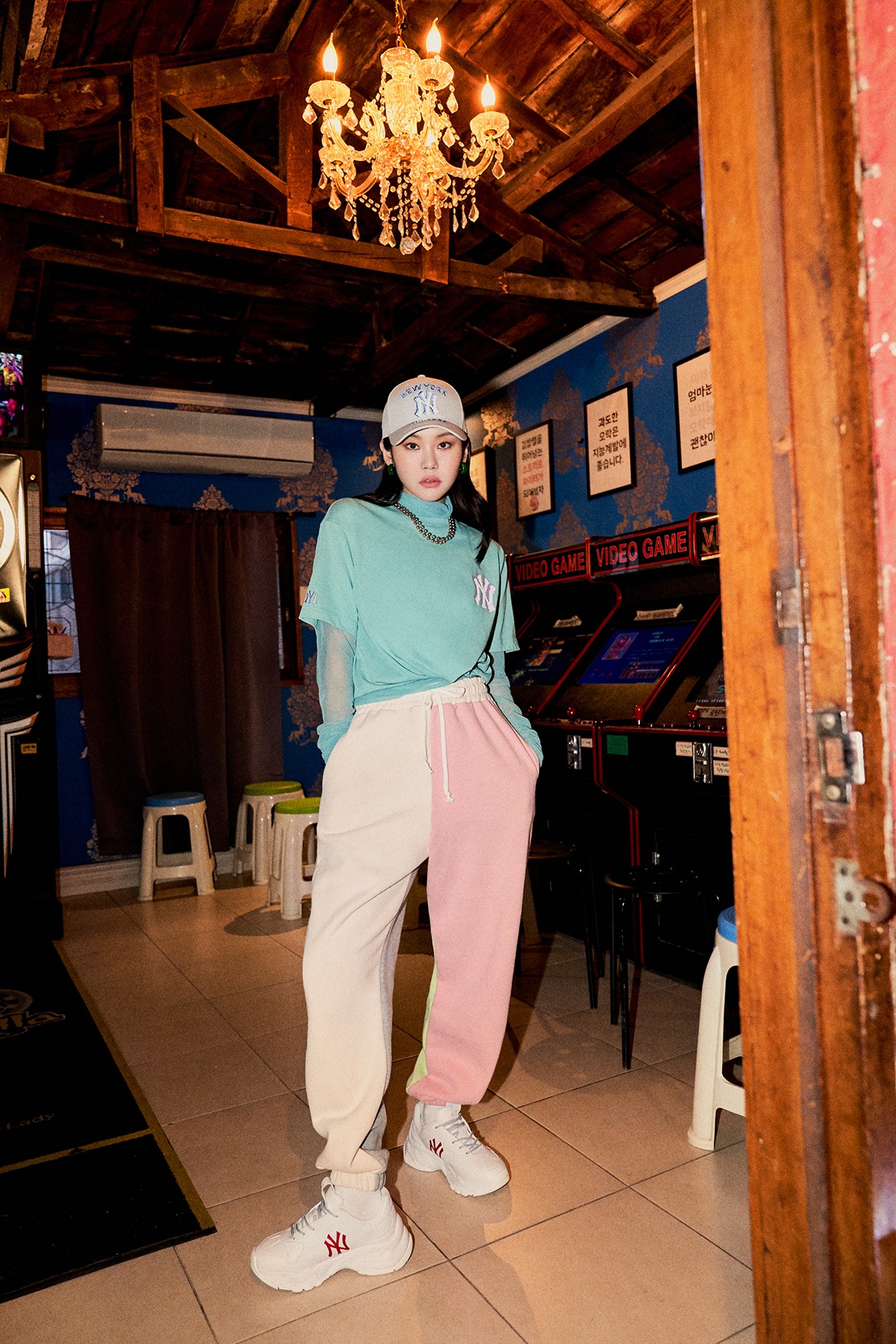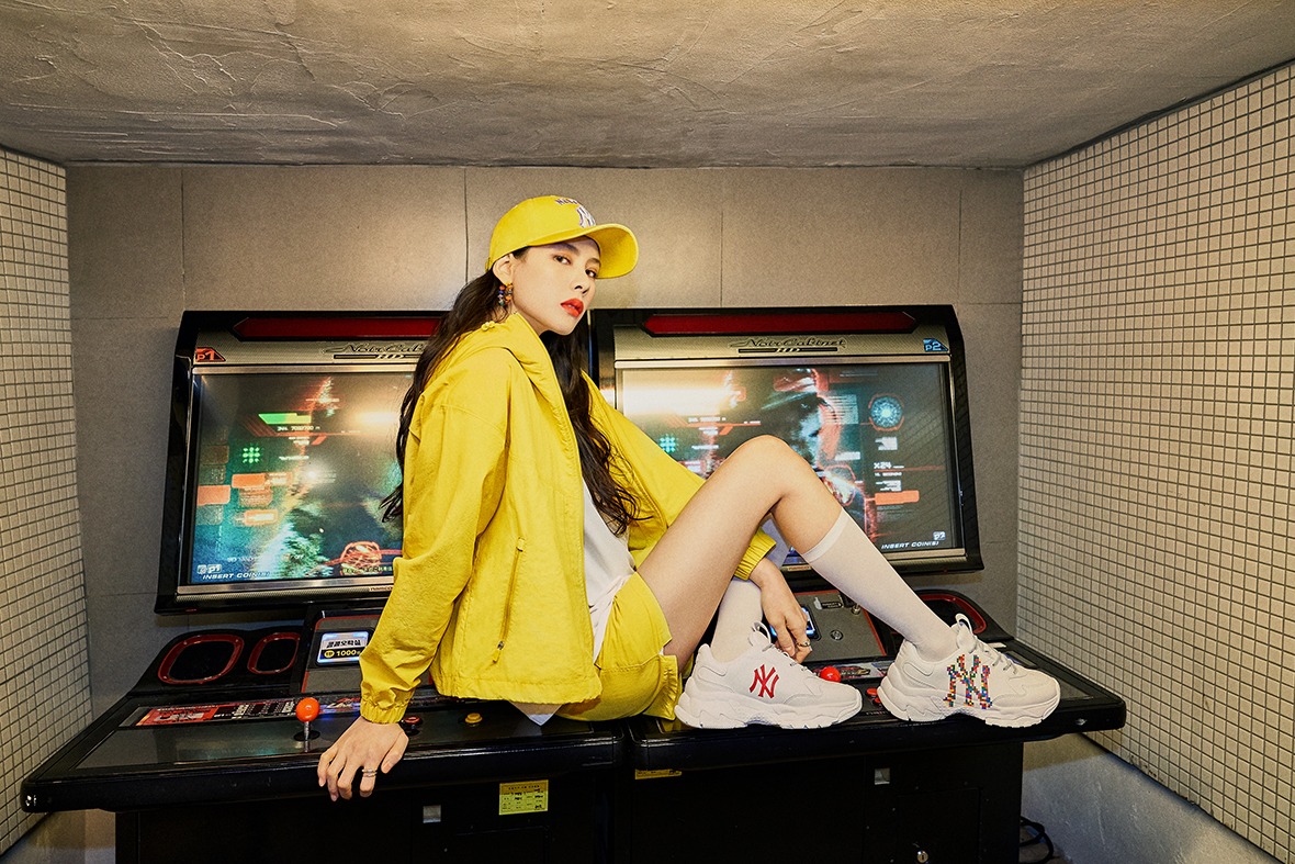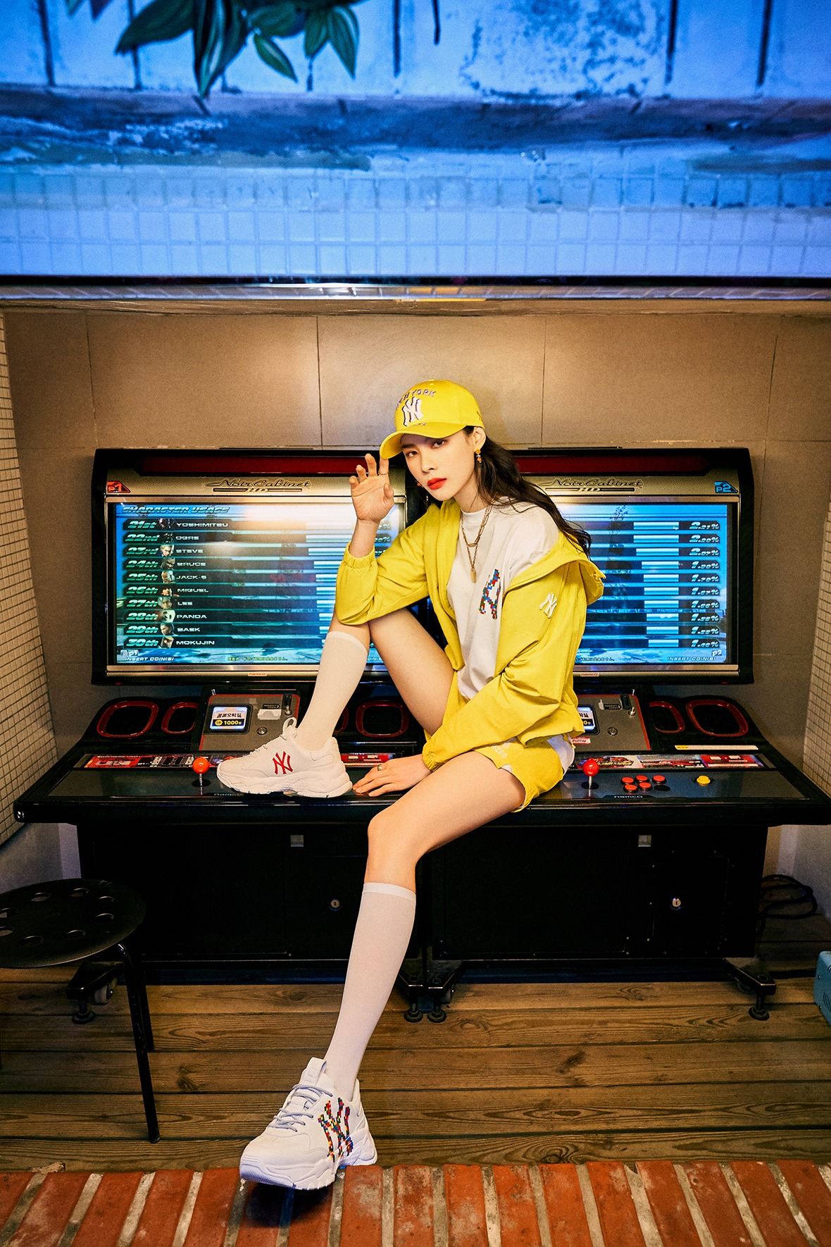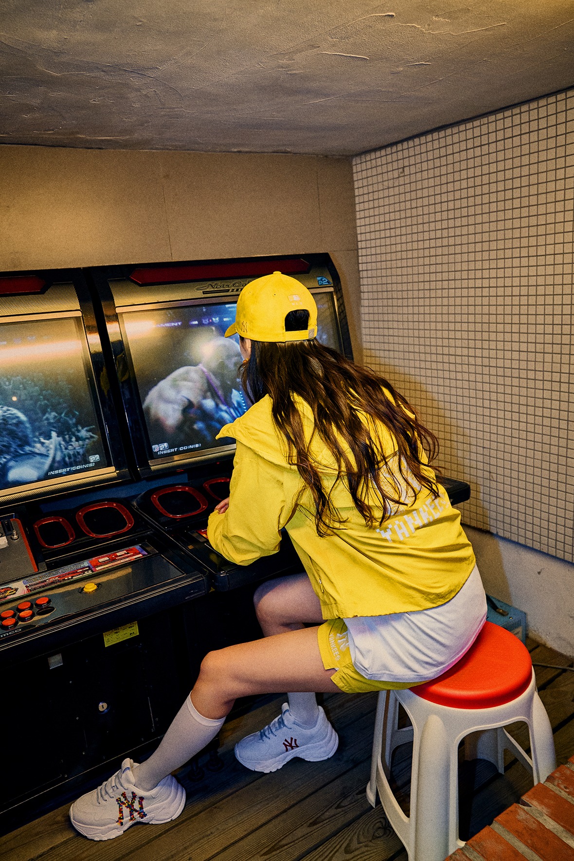 模特南惠琳穿着黄色MLB防风夹克套装,