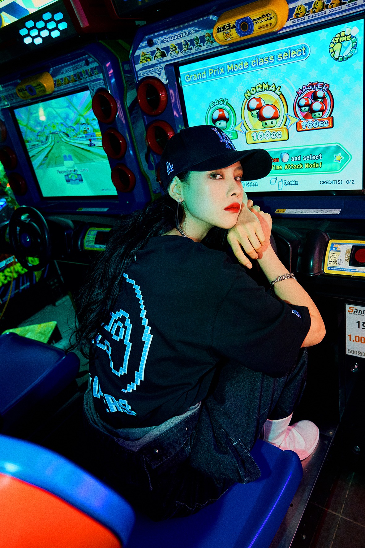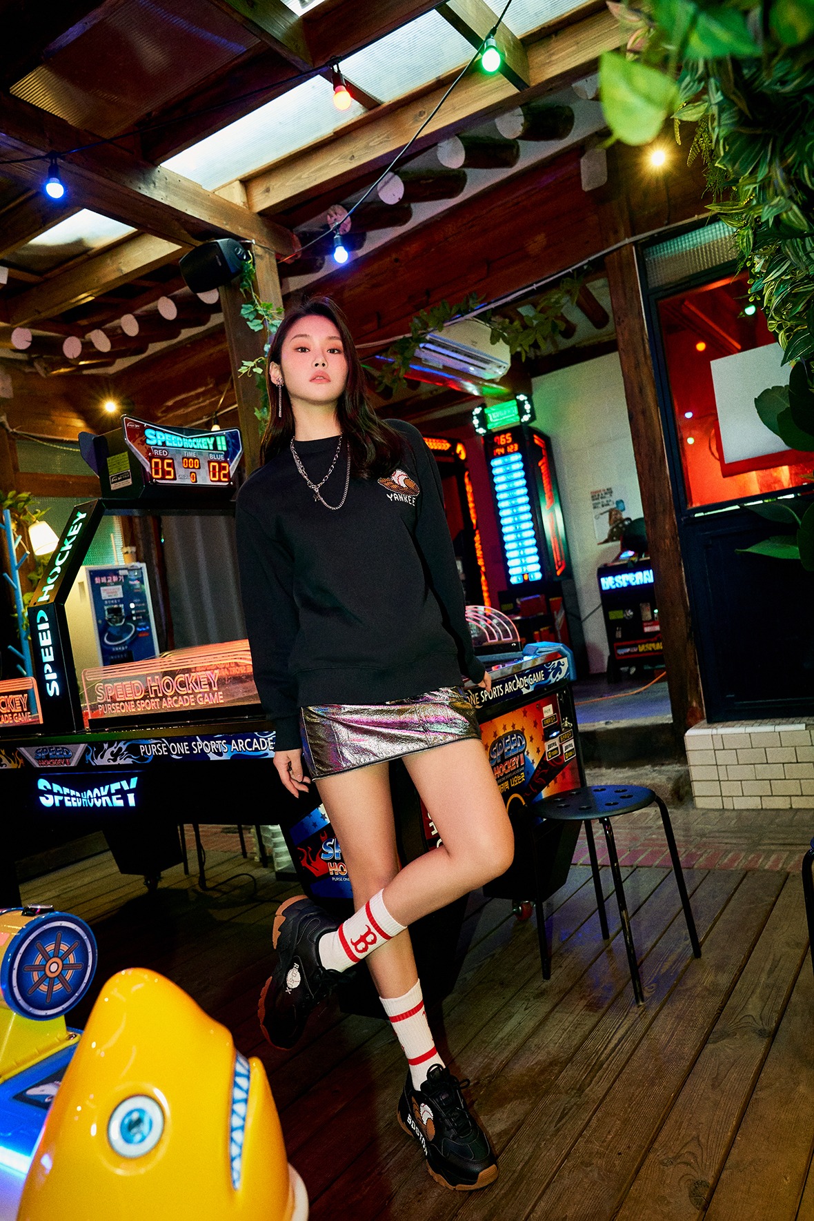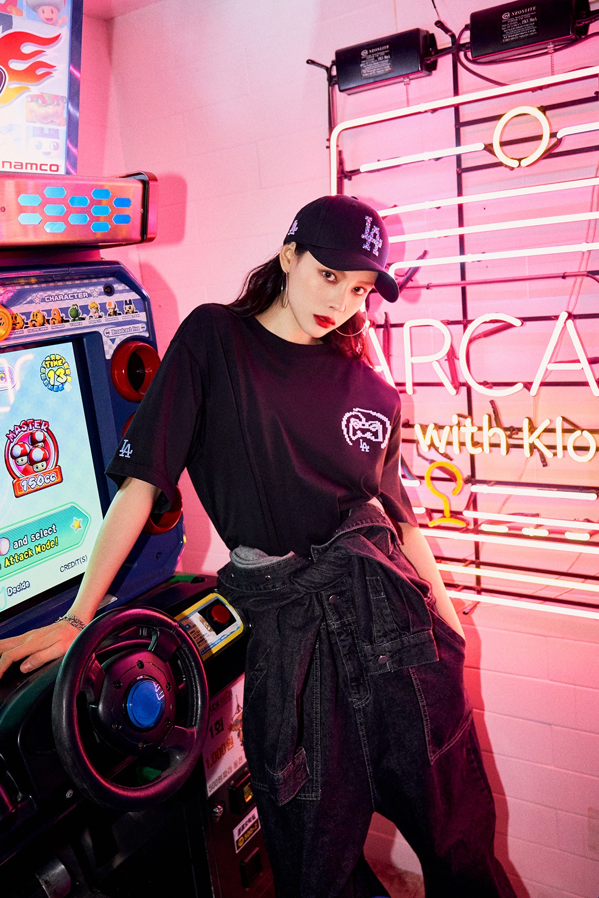 模特金旻桥用MLB PLAY宽松款卫衣完成了完美的新复古风全黑造型。